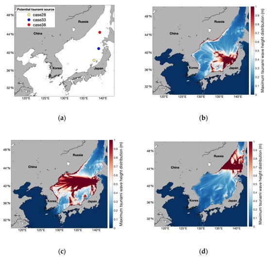 Comparison of maximum tsunami height distributions with the same fault parameters except source location and strike angle: (a) Location map of potential tsunami sources. Maximum tsunami height distributions are shown for (b) case28, (c) case33, and (d) case38.