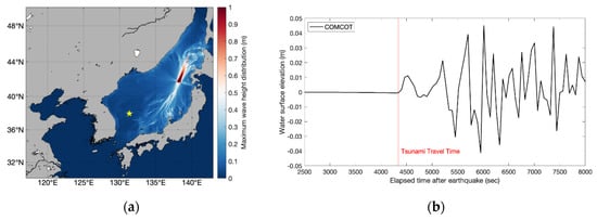 Tsunami arrival time for scenario 01 in Table A1. (a) Randomly chosen point (yellow star, (131.3640° E, 37.9726° N)) displays the maximum tsunami wave height distribution. (b) Water surface elevation at the same random point. The red line indicates the Tsunami Travel Time of a randomly chosen location.
