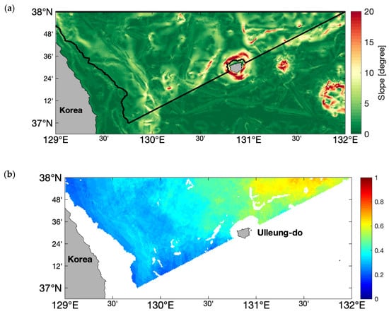 An additional consideration is necessary to determine whether the region chosen for deploying the offshore tsunami observation instruments is appropriate for installing the bottom-mounted sensors. Physical installation conditions include the distance from the earthquake source and flat ocean bottom slope []. The instruments should be located in a safe area to avoid earthquake destruction. This study only considered potential tsunami scenarios on the west coast of Japan, so we focused only on a flat ocean bottom slope as the installation condition. We calculated ocean bottom slope using the same GEBCO bathymetry data that we used for our numerical model input. The standard allowable ocean bottom slope for instrumentation installation is less than 8° []. Considering all of these conditions for all 39 tsunami scenarios, Figure 11 shows the optimal region of tsunami observation instrument deployment. Figure 11a indicates the bottom slope is less than 8° in most areas of our interest except the region near the Ulleung-do island. Figure 11b shows the example result of the colored map for optimal instrument deployment region by considering both Figure 10a and Figure 11a.