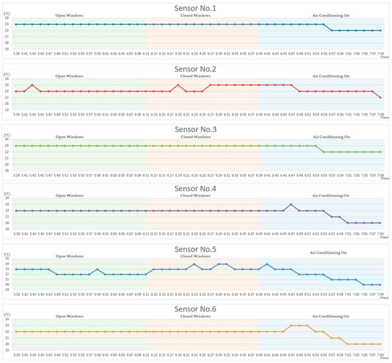 Regardless of the sensors’ locations, whether the windows were opened or not did not affect the temperature and humidity data collected by the sensors. Although it can be seen from Figure 14, Figure 15 and Figure 16 that sensors 1, 2 and 3 were the three sensors closest to the windows, these sensors had almost the same temperature and humidity readings after the windows were closed.