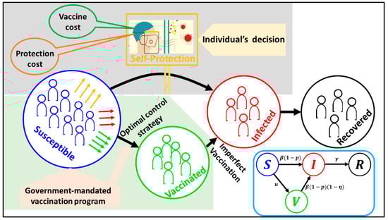 In response to an epidemic, human perception, decision, and behavior play a significant role in controlling disease spreading and imposing intervention policies. Several theoretical and experimental works have already been conducted on evolutionary game theory (EGT) to reveal human behavior in different respiratory diseases and intervention policies to reduce disease transmission [,,]. Inspired by the various seasonal influenzas, several studies [,,,,,,], which implemented several vaccination game dynamics, have analyzed the vaccine cost, effectiveness, and other factors for local and global time scales. The pioneering study of the dynamics of the behavioral game model for vaccination and mask-wearing in a single season introduced by Kabir et al. [] revealed how individuals respond against vaccination and mask-wearing in epidemic spreading, respectively. Physical distancing can also be essential to delay or lessen the spread of disease [,]. Besides awareness [], self-defense measures [,], quarantine, and isolation [] have also received attention to alleviate the condition in the EGT framework. In social dilemma situations under EGT, individuals’ perceptions of self-protective measures can also effectively reduce contagious diseases [,,]. In addition, most EGT-based epidemic models consider the inherent cost, benefit, and risk of infection to adopt the decision of intervention strategies [,,,]. As presented by Kabir et al. [,], the usual form of behavioral dynamics model on EGT to take self-protective measures has received attention. Following the above perception, here we model an epidemic self-protective game model considering maintaining self-protection costs and relative factors. Additionally, we develop a novel theoretical epidemic model that considers both optimal control theory for vaccination and the self-protective game model with the disease spreading over time. To the best of our knowledge, the proposed model is the first to confront two different controlling processes on the same framework to control epidemic spreading.