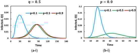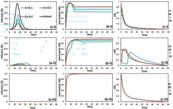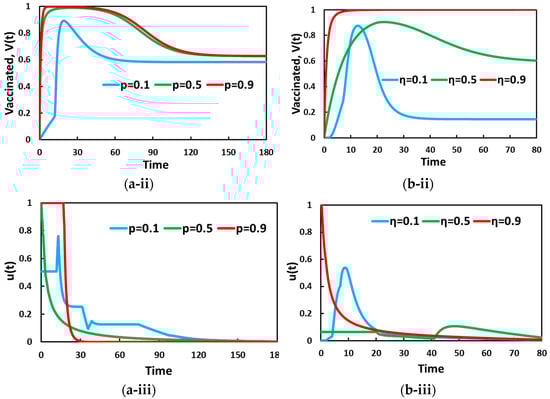 To explore an insightful understanding of evolutionary game theory and optimal control theory in the same context of the two interventions, self-defense measure and vaccination, we present line graphs of the fraction of infected and vaccinated individuals in Figure 3 and Figure 4. Here, Figure 3 and Figure 4 display the set of line graphs for and , respectively, in which, in each figure, panel (a-*), panel (b-*), and panel (c-*) present the fraction of infected, vaccinated, and u(t) over time for varying vaccine efficacy as (*-i) , (*-ii) , and (*-iii) , respectively.