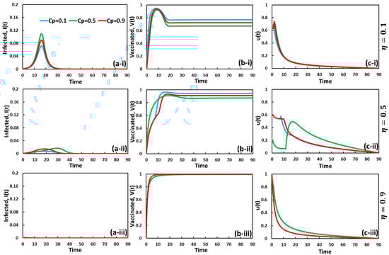 In Figure 3a-*, the fraction of infected individuals declined as vaccine reliability (eta) increased. Since vaccine reliability quantifies the enhancement of immunized people in society, it was expected to significantly control disease outbreaks. It was also observed that the infected outcomes were higher when (sub-panel (a-i)), and an almost disease-free equilibrium state was obtained for (sub-panel (a-i)). The introduction of control policies (vaccination) can successfully perform better when vaccine efficacy is high and the cost is low, as displayed in sub-panel (a-iii) and (b-iii). The autonomous vaccination process works effectively and does not involve behavioral dynamics (self-defense) when its reliability performs extraordinarily; higher vaccinated areas ensure more efficient ways to reduce the contagious disease severity.