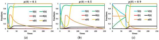 Figure 5 illustrates the impact of the initial self-protection measure on the optimal control strategy’s vaccination uptake. It highlights how the presence of initially self-protected individuals influences the timing of infection onset and the rate at which vaccination uptake peaks. In Figure 5a, when the initial self-protection measure rate is lower, infections arise early, resulting in the rapid spread of the disease. Consequently, vaccination uptake also reaches its peak within a very short period, indicating that a refusal or lack of adherence to self-protection measures accelerates the onset of infections, leading to a faster progression of the epidemic. Simultaneously, individuals recognize the urgency and promptly seek vaccination, contributing to a swift increase in vaccination rates. However, in Figure 5c, when the proportion of initially self-protected individuals is higher, there is a delay in the spread of the disease. A more significant number of individuals practicing self-protection measures slows the transmission of the infection, effectively slowing down the epidemic. This delay in spreading conditions also affects the rate at which vaccination uptake occurs. The slower progression of the epidemic allows more time for individuals and governments to make informed decisions regarding vaccination strategies and other necessary interventions. Therefore, higher initial self-protection rates reduce the incidence of infection and delay the onset of an epidemic. This delay provides valuable time for authorities to implement appropriate measures, allocate resources, and effectively manage the situation. Moreover, the slower pace of vaccination uptake allows for a more strategic and organized approach to immunization, ensuring that it is carried out efficiently and reaches a more significant portion of the population.