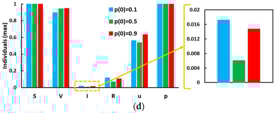 A notable observation can be made from Figure 5b, which examines the scenario when the initial self-protection rate is intermediate (); it becomes apparent that a lower infection rate is observed. In Figure 5d, the distribution bar graph provides insights into the maximum number of individuals in various compartments. In this case, (susceptible individuals) and (proportion of self-protected individuals) show no significant differences across the three scenarios. However, it is worth noting that (vaccinated individuals) and (control variable) exhibit higher values when the initial self-protection rate is set to . On the other hand, both (infected individuals) and (recovered individuals) display a noticeable reduction when the initial self-protection rate is at its intermediate value of . From these observations, implementing vaccination and self-protection measures at a reasonable rate reduces infection rates and ultimately decreases the final size of the epidemic. The scenario with an intermediate initial self-protection rate of demonstrates a favorable outcome, showing lower infection rates than the other cases. Therefore, the findings from Figure 5b and d highlight the importance of balancing vaccination and self-protection measures. Implementing these measures at a reasonable and coordinated rate can effectively mitigate the spread of infections, reducing the overall impact of the epidemic.