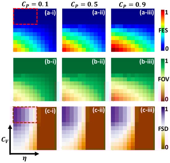 Figure 7 showcases several graphs in panels (a-*), (b-*), and (c-*) that highlight the 2D phase diagrams. These diagrams are focused on capturing the final epidemic size (FES), the fraction of vaccinators (FOV), and the fraction of self-protected individuals (FSD) within the parameter space defined by (). Sub-panels (*-i), (*-ii), and (*-iii) present detailed representations of the overall phase behavior under different vaccine effectiveness values (), specifically and .