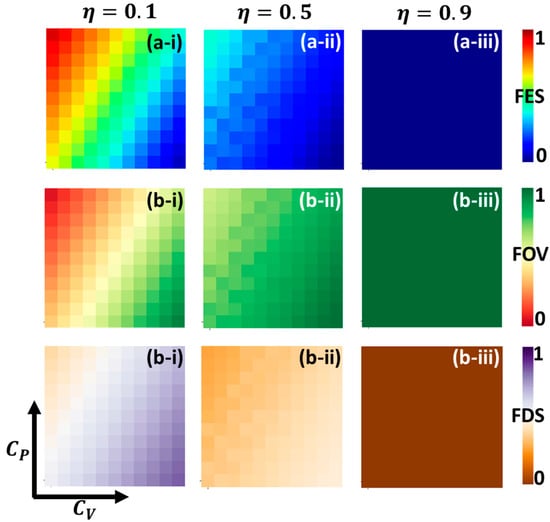 Figure 6 displays multiple graphs in panels (a-*), (b-*), and (c-*) to emphasize the 2D phase diagrams. These diagrams focus on the final epidemic size (FES), the fraction of vaccinators (FOV), and the fraction of self-protected individuals (FSD) within the parameter plane defined by (). The sub-panels (-i), (-ii), and (*-iii) provide detailed representations of the overall phase behavior for different self-protection costs (), specifically and . Notably, all the 2D graphs in the figure illustrate the disease-free equilibrium region, visually represented by the color blue.