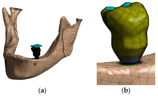 A three-dimensional mandible model was used in this study and obtained following the reconstruction steps described in a Vasco et al. study [21] (Figure 3a). The required geometric changes were performed in SolidWorks 2013 (Dassault Systemes, Solidworks Corps, Waltham, MA, USA). To decrease computational time, the models were edited to use edentulous jaw, along with the tooth model 36 of the jaw to provide the external geometry of the future implant prosthesis, as shown in Figure 3.