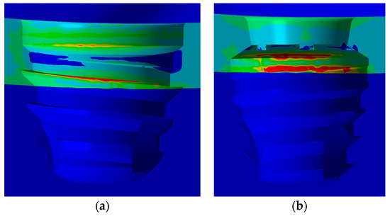 Stress concentrations in the IH connection implant are observed both in the palatal portion of the implant platform and in the first internal threads in the vestibular region as shown in Figure 9a.