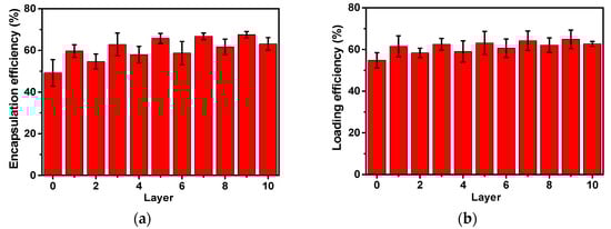 Encapsulation efficiency results reveal that 49.2% of CUR was loaded into CMAPs and the encapsulation efficiency increased to 67.5% with increasing number of layers of CHI and SA (see Figure 5a). For particles with the same type of polymer (CHI or SA) on the outermost surface an increased trend of encapsulation efficiency was observed with increasing layer number. However, as illustrated in Figure 5a, a higher encapsulation efficiency of CUR was observed for CMACPs with CHI as the outermost layer (layer number: 1, 3, 5, 7 and 9) compared to SA as the outermost layer (layer number: 2, 4, 6, 8, 10). The most feasible explanation for this is the different surface charges between the particle outermost layers. As illustrated in Figure 1a, CHI layers exhibited positive surface charges in water while SA layers exhibited negative surface charges. Therefore, the negatively charged CUR molecules are adsorbed on the surface of the CHI layer more readily, facilitating a more efficient and faster encapsulation into polymer matrix. On the other hand, SA layer was negatively charged in water, and thus CUR molecules were less readily to interact with the particle surface, due to the electrostatic repulsion. Moreover, larger amount of CUR molecules were expected on the surface of CHI layer, which also led to a higher encapsulation efficiency. The same hypothesis can be used to explain the loading efficiency of CMAPs and CMACPs. As shown in Figure 5b, a higher loading efficiency of CUR was observed for MACPs with CHI as the outermost layer to those with SA as the outermost layer. Higher loading efficiencies from 54.8% to 64.9% were achieved for CMAPs and CMACPs compared to many previously reported CUR loaded CHI and alginate based particles [25,28,38] with loading efficiencies from 2.7% to 48%, suggesting CMAPs and CMACPs possess great potential loading CUR into nanoparticles for drug delivery applications.