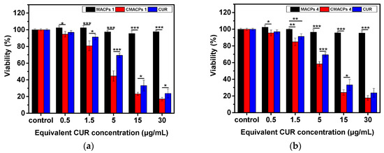 The cytotoxicity of free CUR, MACPs, and CMACPs against MDA-MB-231 and HDF cells was investigated using the MTT assay. MDA-MB-231 or HDF cells were seeded into 96-well plates at a density of 5 × 103 cells per well and incubated overnight at 37 °C and 5% CO2. The media were then removed and replaced with CUR medium solution, MACPs or CMACPs dispersions (CUR content in the particles is equivalent to the dosage of free CUR) to reach the final CUR concentrations of 0.5, 1.5, 5, 15, 30 μg/mL. After 48 h of incubation, 50 μL of 3 mg/mL MTT was added to each well and incubated at 37 °C for 3 h followed by removing the supernatants and adding 200 μL DMSO. A plate reader (FLUOstar galaxy, BMG LABTECH, Ortenberg, Germany) was used to measure the absorbance of each well, including control wells, containing only cells and medium at 570 nm. The relative cell viability was determined by comparing the absorbance with control wells.