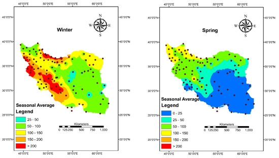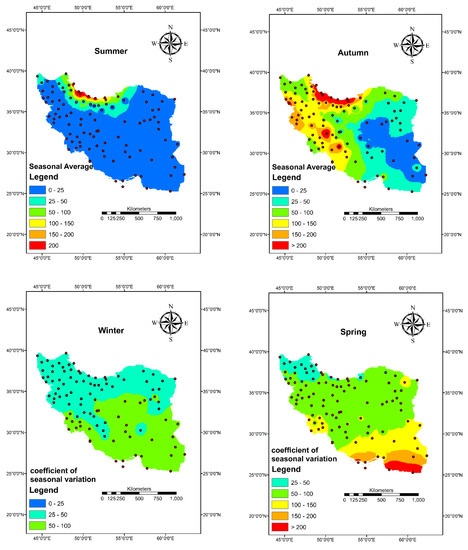 The long-term average of precipitation and coefficient of variation in different seasons were presented in Figure 2. According to this figure, the maximum precipitation occurs in winter and in the next step in autumn. Additionally, the western and especially the coastal regions in the north receive much more precipitation in all seasons compared to the other parts of the country. There is generally a diagonal reduction in precipitation from northwest to southeast in almost all seasons. Based on Figure 2, the coefficient variation of precipitation during winter is less than 100%. The country can be divided into northern and southern parts with less and more than 50% of the coefficient of variation, respectively. In autumn and spring, the coefficient of variation in the south and southeast parts is more than 100%, while in the other regions it is less than 100%. The highest coefficient of variation could be found in summer precipitation, where the coefficient of variation in almost all parts of the country is more than 100%.