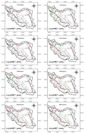 For PDO, in winter, the whole of the country shows a positive correlation with PDO except in one station in the west. In the spring, the north, northwest, and northeast (except some stations in the northwest and northeast) show a positive correlation. The south, southwest, and central parts of the country have no meaningful correlation with PDO, and the rest shows a negative correlation. In the summer, the southeast and some regions in the southwest and west of the country represent a negative correlation, and the other regions follow a positive correlation with PDO in general. In autumn, the southeast and northwest of the country have a positive correlation with PDO, and the rest of the country represents a negative correlation.