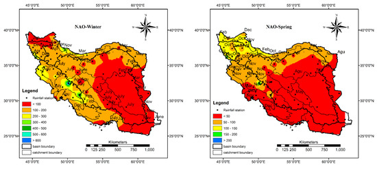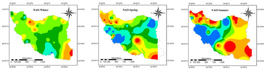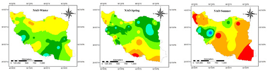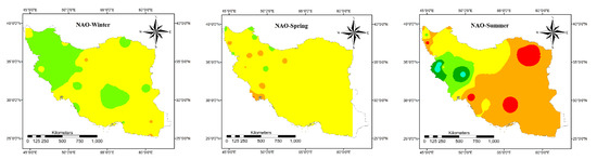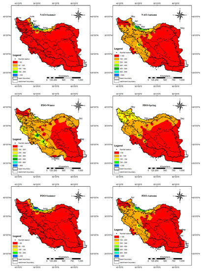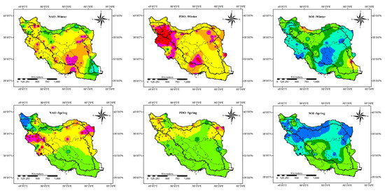 Finally, the average increase/decrease in precipitation due to the change in PDO, NAO, and SOI values is calculated and plotted in Figure 6, Figure 7, Figure 8, Figure 9 and Figure 10. Based on Figure 6, when the PDO, NAO, and SOI values are less than −2, different seasonal precipitation patterns can be detected. Generally in winter, when the PDO and NAO values are less than −2, the whole country encountersan approximate 25% decrease in precipitation. Just north and especially southeast of the country may have above average precipitation associated with NAO < −2. However, SOI < −2 intensifies the precipitation in almost all parts of the country. It is considerable in the east and middle of the country. In spring, all three indices intensify the precipitation in the southern half of the country, while PDO decreases the precipitation in northern parts and NAO in the middle and northeast. In general, SOI has the most significant impact on spring precipitation. In summer, all indices increase the precipitation in the east of the country. However, SOI leads to a considerable decrease in precipitation in the northwest while NAO and PDO increase the precipitation in the northwest. Additionally, NAO and PDO lead to a significant decrease in precipitation in the middle of the country while SOI increases the precipitation. In the autumn, each index has a unique impact on precipitation. NAO decreases the precipitation in the northwest and southeast and an increase in other parts. PDO intensifies the precipitation in all parts of the country except in the southeast. SOI increases the precipitation in the northwest, southwest, and west, and in some parts in the southeast and in the rest of the country, decreasing precipitation is dominant.
