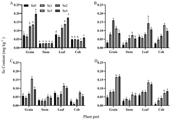 Effects of selenium application on selenium content in maize plants at different densities. Description of treatment groups: (A,B) represent 67,500 plants ha−1 (D1) and 75,000 plants ha−1 (D2), which were the two planting densities in 2021; (C,D) represent 67,500 plants ha−1 (D1) and 75,000 plants ha−1 (D2), which were the two planting densities in 2022. Se0: selenium fertilizer application of 0 g ha−1; Se1: selenium fertilizer application of 75 g ha−1; Se2: selenium fertilizer application of 150 g ha−1; Se3: selenium fertilizer application of 225 g ha−1; Se4: selenium fertilizer application of 300 g ha−1. Different lowercase letters in the same column indicate significant differences among different treatments (p < 0.05).