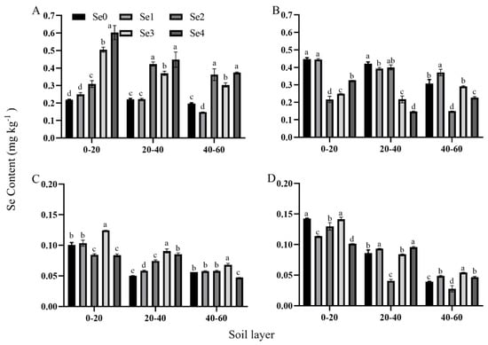 Effects of selenium application amount on selenium content in soil layers with different densities. Description of treatment groups: (A,B) represent 67,500 plants ha−1 (D1) and 75,000 plants ha−1 (D2), which were the two planting densities in 2021; (C,D) represent 67,500 plants ha−1 (D1) and 75,000 plants ha−1 (D2), which were the two planting densities in 2022. Se0: selenium fertilizer application of 0 g ha−1; Se1: selenium fertilizer application of 75 g ha−1; Se2: selenium fertilizer application of 150 g ha−1; Se3: selenium fertilizer application of 225 g ha−1; Se4: selenium fertilizer application of 300 g ha−1. Different lowercase letters in the same column indicate significant differences among different treatments (p < 0.05).