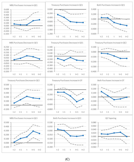 In contrast, from Figure 2, Panel A, during events of an increase in Treasury purchases (i.e., in QE1, QE2 and OT), the mortgage rate barely declined or even rose up a bit on event day and days after the event day. CARs of the mortgage rate one day after the event day remained 0.00, −0.02 and −0.01 percent for events in QE1, QE2 and OT, respectively. Again, from Figure 2, Panel C, during the same event, the Treasury rate dropped sharply on the event day and after. CARs of the Treasury rate one day after the event day collapsed to −0.61, −0.13 and −0.50 percent for events in QE1, QE2 and OT. The evidence strongly supports the previous conclusion that events of increase in MBS purchases lowered the mortgage rate more than the Treasury rate, while events of increase in Treasury purchases lowered the Treasury rate more than the mortgage rate around event days.