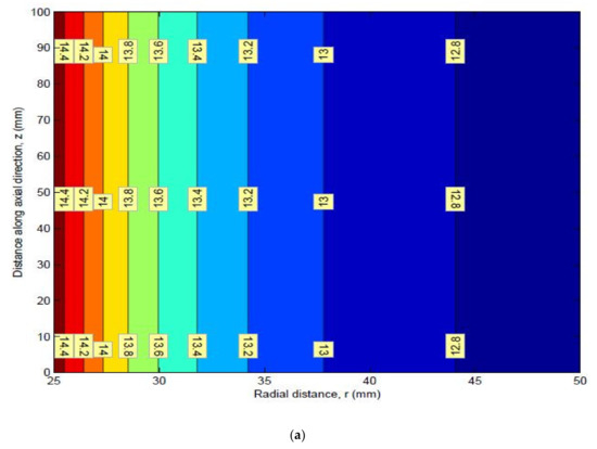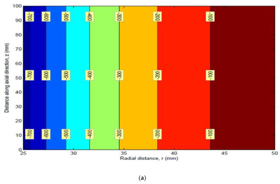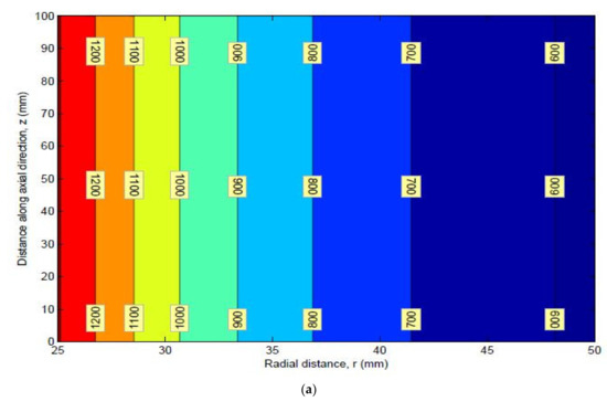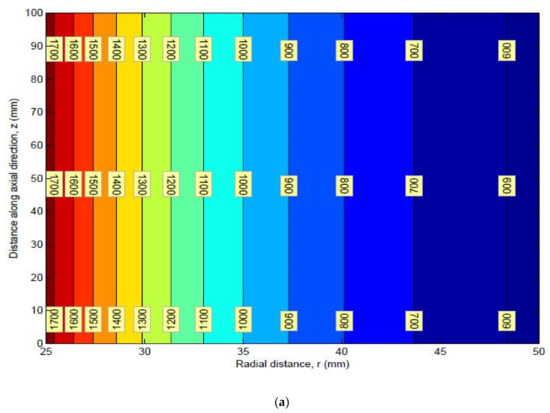 The dimensions of the thick pipe section were taken as L of 100 mm, of 25 mm, and of 50 mm. The material properties of HK40 are given as follows: elastic modulus Pa, Poisson’s ratio of 0.313, thermal expansion coefficient . The obtained values of the radial stress, circumferential stress, axial stress, and von Mises stress are shown in Table 1. Graphs of different stresses vs. radius are shown in Figure 2 and Figure 3.