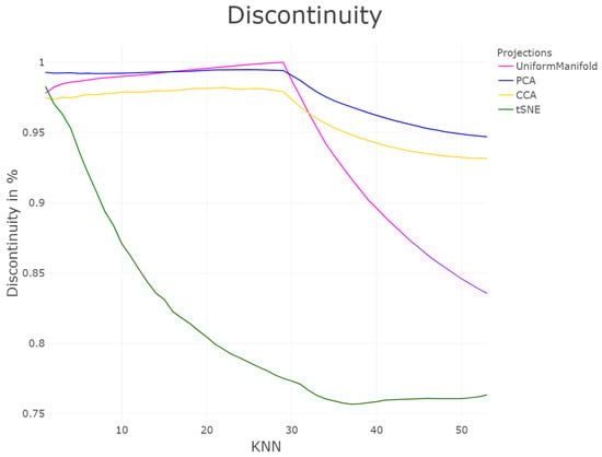 Freely available implementations of the trustworthiness and discontinuity (T&D) measures and the precision and recall (P&R) measures in C++ code were used (see R package ProjectionBasesClustering on CRAN). For all other measures, self-developed implementations were used available in the R package “DRquality” on CRAN (https://CRAN.R-project.org/package=DRquality, accessed on 11 July 2023).