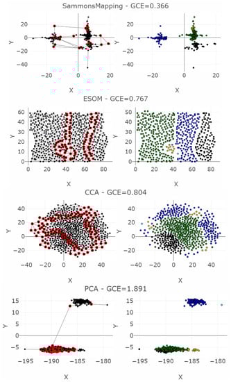 For the projection methods considered here we used freely available code which is summarized in the ProjectionBasedClustering CRAN package. For principal component analysis (PCA) [86], we used the PCA software available in the R package stats [87]; for curvilinear component analysis (CCA) [56], the CCA source code was ported from MATLAB to R and for t-distributed stochastic neighbor embedding (t-SNE), we used Donaldson’s t-SNE implementation. Also included in the evaluation of various projection methods were the Neighbor Retrieval Visualizer (NeRV) algorithm [8] as implemented in the freely available C++ code called in R., the Sammon Mapping technique for multidimensional scaling (MDS) [88] available from [87], and the emergent self-organizing map (ESOM) algorithm as implemented in the R package Umatrix available on CRAN (https://CRAN.R-project.org/package=Umatrix, accessed on 11 July 2023).