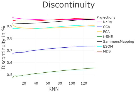 Venna and Kaski claim that the trustworthiness () quantifies from “how far from the original neighborhood [in the input space I the new points [] entering the [output-space] neighborhood [H(knn, O/I)] come” [32]. For the calculation of the T&D measurements, KNN graphs must be generated for various knn values. Then, the trend of the curve can be interpreted. It is unclear how many knn values must be considered. Hence, knn values up to 25% of the total number of points are plotted. Lee and Verleysen showed that the T&D measurements can be expressed as a special case of the co-ranking matrix [28].