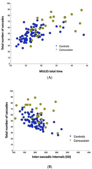 There was a significant correlation (Figure 4A) between longer (worse) MULES times and increased numbers of saccades in both groups (r = 0.46, p = 0.026 and 0.63, p = <0.00001 in control and concussion history, respectively). There was also a significant correlation (Figure 4B) between ISI and the number of saccades in both groups (r = −0.62, p = 0.0016; r = −0.46, p = 0.00078 for control and concussion groups, respectively). No significant correlation was observed between the MULES times and ISI in either group (Figure 4C).