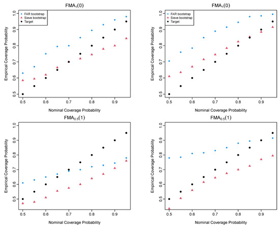 Empirical vs. nominal coverage probabilities of the four FMA processes when (left column) and (right column).