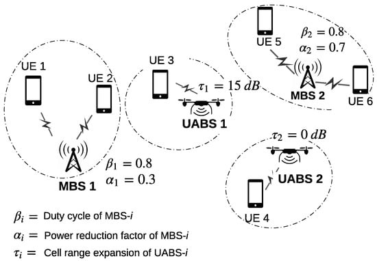 In a HetNet, the MBSs transmit at higher powers and have higher ranges compared to the lower power UABSs. Nevertheless, the UABSs can extend their coverage and associate a larger number of UEs by using the cell range expansion (CRE) technique defined in 3GPP Release-8. The CRE of a UABS is defined as the factor by which UEs are biased to associate with that UABS. For example, in Figure 2, UABS 1 uses a CRE of 15 dB to force UE 4 to associate with itself. The use of CRE, however, results in increased interference to those UEs in the extended cell regions.