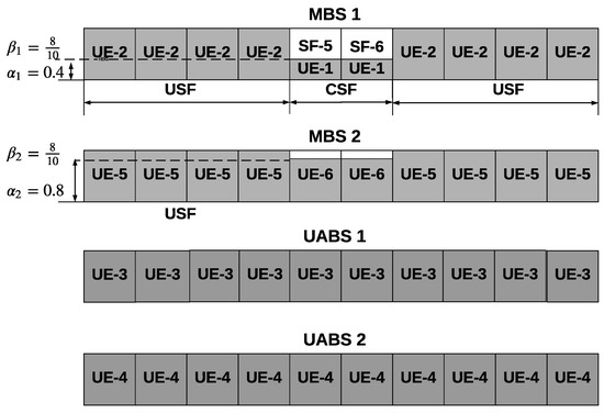 We denote this power reduction factor by where . We note that implies no ICIC, while eICIC techniques use , and FeICIC techniques allow to vary between 0 and 1. We use to denote the USF duty cycle, and hence, the CSF duty cycle is given by . Figure 3 shows, for the scenario depicted in Figure 2, how MBS 1 and MBS 2 use power reduction factors, and respectively, to reduce interference to UE 3. We note that , as MBS 2, being farther away from UE 3, can transmit at a higher power without degrading the performance of UE 3.