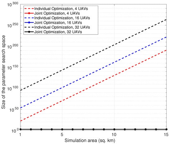 The large size of the search space can be appreciated by referring to Table 2 and Table 3, which list the range and size of the parameters to be optimized. In this table, the parameters and denote the step sizes for coordinate of a UABS’s location, and y coordinate of a UABS’s location, respectively, while and denote the lower bounds for and , respectively. Similarly, and denote the upper bounds for and , respectively. The actual size of the parameter space is depicted in Figure 4, which shows the number of possible states in , over which the individual or joint optimization algorithms have to search, in order to find the best state, .