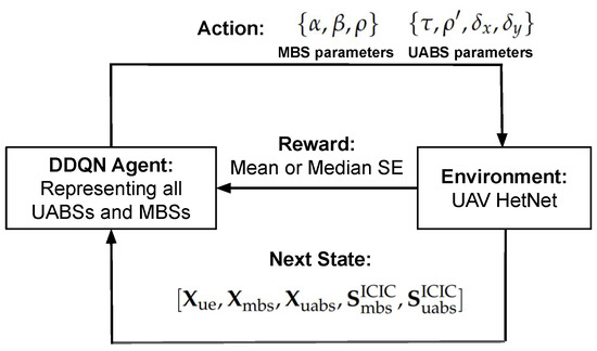 The Q learning algorithm is one of the commonly used reinforcement learning (RL) algorithms []. In reinforcement learning, an agent interacts with an environment by taking actions in different states and observing the costs or rewards of the actions. The agent starts out with random actions and. eventually, by observing the rewards and by exploring different states, it learns the best action to take in each state in order to optimize the cumulative reward. Figure 5 shows the interaction of the MBS and the UABS agent with the UAV HetNet environment considered in this paper.