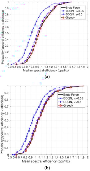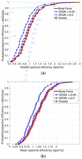 For 8 MBSs per km (two MBSs in the simulation area), the CDF of median and mean SE achieved by the algorithms are shown in Figure 7a,b, respectively. Again, the DDQN performance is better when using (achieving of the optimal median SE and of the optimal mean SE), than when using an (achieving of the optimal median SE and of the optimal mean SE). The greedy algorithm achieves the optimal results in the scenarios that we consider. The time complexity of the exhaustive search is exponential in the number of MBSs and UABSs and is given by: