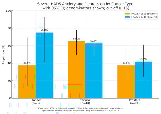 Background/Objectives: Psychiatric morbidity is frequent in oncology, yet prevalence and correlates differ across tumour sites. Urogenital cancers, in particular, involve psychosocial stressors related to sexuality, fertility, continence, and body image, which may intensify anxiety and depression. This study aimed to estimate the proportion