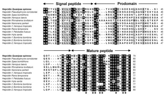 Background/Objectives: Hepcidin is a cysteine-rich antimicrobial peptide that links iron homeostasis and innate immunity in vertebrates, but its functions in amphibians remain poorly understood. The Chinese spiny frog (Quasipaa spinosa) is an economically important species that suffers serious losses from