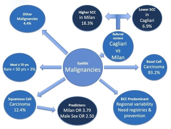 Background/Objectives: Eyelid malignancies represent a clinically relevant subset of cutaneous tumors of the head and neck, with significant functional and cosmetic implications. While basal cell carcinoma (BCC) is the predominant subtype, geographic differences in the relative frequency of squamous cell carcinoma (SCC) and rarer histotypes have been reported. This study aimed at comparing the distribution of malignant eyelid tumors diagnosed in two Italian referral centers, namely Cagliari (Sardinia) and Milan (Lombardy) between 2020 and 2024, and to explore demographic and epidemiologic correlates. Methods: A total of 250 malignant eyelid tumors were analyzed: 130 from Cagliari and 120 from Milan. BCC was the most common histological subtype overall (83.2%), followed by SCC (12.4%) and other malignancies (4.4%). The proportion of SCC was significantly higher in Milan (18.3%) compared to Cagliari (6.9%, p = 0.04). Logistic regression confirmed Milan as an independent risk factor for SCC (OR 3.79; 95% CI 1.57–9.18; p = 0.003). Male gender also emerged as a predictor of SCC (OR 2.50; 95% CI 1.10–5.67; p = 0.029). Most cases occurred in patients ≥70 years; cases under 50 years were rare (≈3%). Conclusions: BCC remains the predominant malignant eyelid tumor in Italy; significant inter-regional variability exists, with a higher proportion of SCC in northern Italy. These findings highlight the role of environmental, demographic, and organizational factors, and emphasize the need for multicenter registries. Region-specific insights may inform personalized prevention and surveillance strategies for eyelid malignancies. These findings may support the development of region-tailored prevention models and contribute to the growing field of personalized oncology within ophthalmology.