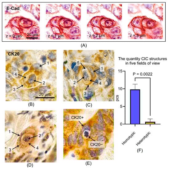 Background: Cell-in-cell (CIC) structure is a histological picture of a whole cell inside another cell. Homotypic CIC structures formed by cancer cells are consistently demonstrated to be a factor of poor prognosis and resistance to chemo- and immunotherapy in colorectal cancer (CRC). However, the absence of a standardized counting method limits the use of this factor in the applied research. Objective: To propose an adapted method for quantifying CIC structures in CRC surgical specimens and to evaluate their correlation with established adverse prognostic factors. Methods: A total of 250 histological slides of surgical specimens from 58 patients with pT1-pT4 colorectal adenocarcinoma were studied. Identification of tumor cells and visualization of CIC structures were performed by immunohistochemistry (CK20). Quantitative assessment was performed on digital scans of H&E stained slides. Quantitative assessment was performed on digital slide scans stained with H&E. CIC structures were counted in 5 fields of view corresponding to a ×40 objective (0.975 mm2). A correlation analysis of CIC structures with CRC poor prognosis factors was performed. Results: Immunohistochemical study (CK20) confirmed the formation and prevalence of homotypic structures (95%) over heterotypic ones (5%) (p < 0.001). This finding informed the evaluation of H&E-stained slides and the formulation of criteria for CIC structure identification. A significant predominance of CIC structures in the invasive front was established compared to the tumor central zone (16.7 ± 5.2 and 1.2 ± 1.3 per 5 fields of view, respectively, p < 0.0001). Correlation analysis revealed weak but statistically significant relationships with the tumor-stromal ratio, the tumor buds number and the density of tumor-infiltrating lymphocytes. No correlations were found with the right- or left-sided location, pTNM, grading, lymphovascular and perineural invasion. Conclusions: The paper presents the adapted CIC structures counting method for surgical specimens of CRC, defines the criteria of the CIC, and demonstrates a higher number of CIC structures in the tumor invasive front. Weak correlations between the CIC structures and established factors of CRC poor prognosis are obtained.