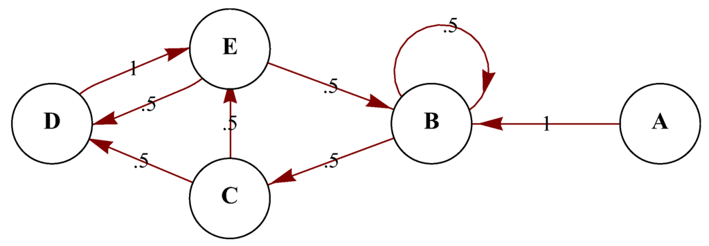 An example of a simple 5-state Markov chain with simple transition probabilities represented as a stochastic finite-state automaton diagram.