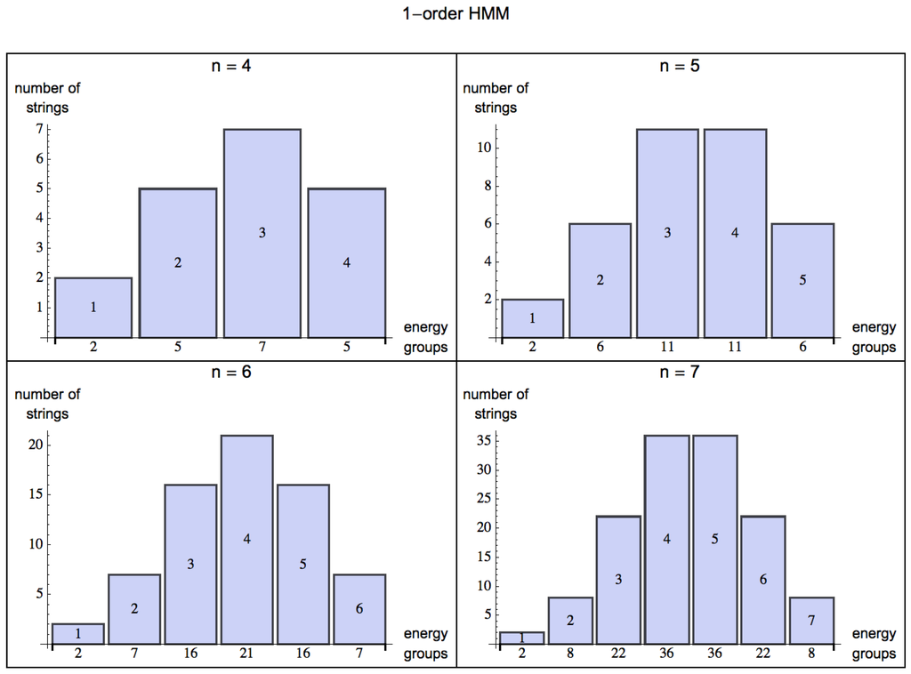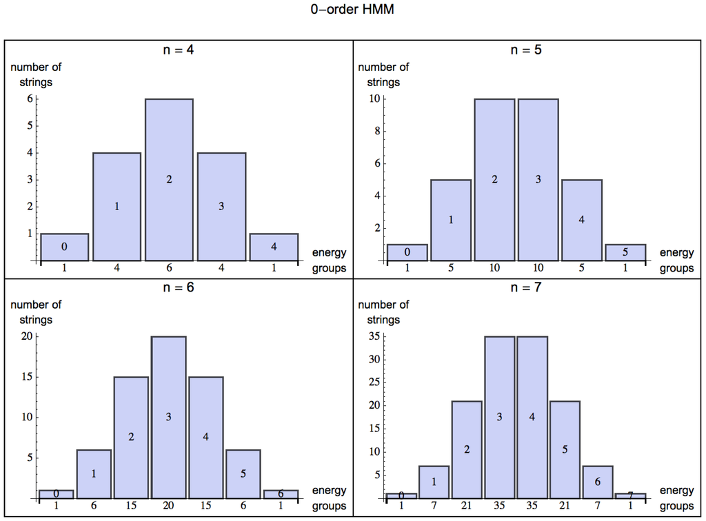 There are distinct binary strings of length n. The probability of picking 1 among the is . We are interested in converting information (bits) into energy, but putting bits together means working with strings. Every bit in a string represents a state in the HMM; it will be 0 or 1 according to a probability value (a belief). So in this example, the organism processes information by comparing every possible outcome to the actual outcome, starting with no prior knowledge (the past is irrelevant). We know that for real organisms, the (evolutionary) past is very relevant, and it is often thought of in terms of a genetic history. This is indeed how we will conceptualize it. We will take advantage of what an HMM allows us to describe in order to model this “past".