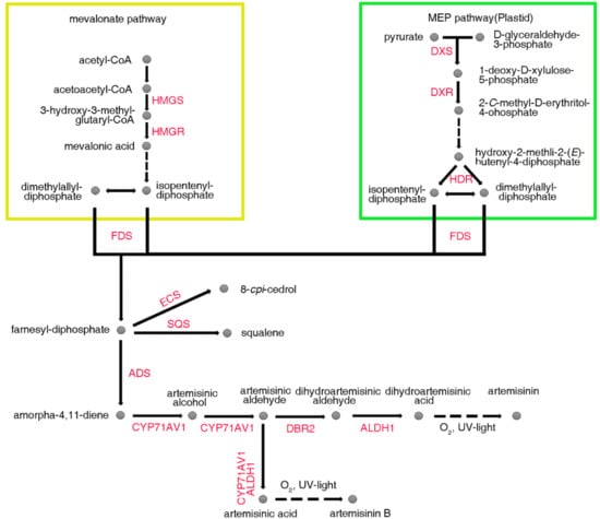 Artemisinin is a sesquiterpene lactone with a peroxy bridge structure (i.e., 1,2,4-three dioxane ring) and its biosynthetic pathway has been clearly identified (Figure 1). In plants, this five carbon-skeleton compound has two independent biosynthetic pathways, which are the mevalonate (MVA) pathway and are located in the cytoplasm, and the methylerythritol phosphate (MEP) pathway, which occur in plastids []. The metabolic steps before the farnesyl diphosphate (FPP) synthesis are considered as an upstream of artemisinin biosynthesis, and FPP is formed by isopentenyl diphosphate (IPP), which is provided by the MVA and MEP pathways []. Under the catalysis of amorpha-4,11-diene synthase (ADS), FPP closed-loop produces amorpha-4,11-diene [], which is oxidized to sequentially generate artenimol, artemisinic aldehyde, and artemisinic acid, which is catalyzed by the cytochrome P450 monooxygenase CYP71AV1 [,,]. Under the catalysis of artemisinic aldehyde delta11(13)-reductase (DBR2) and aldehyde dehydrogenase 1 (ALDH1), artemisinic aldehyde is converted to dihydroartemisinic acid [], which is converted to artemisinin.