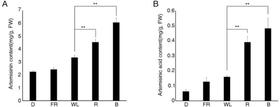 Artemisinin (A) and artemisinic acid (B) content under different light treatments. In (A) and (B), data represent means ± standard deviation of biological triplicates (10 seedlings per repeat). D—darkness; FR—far red light; WL—white light; R—red light; B—blue light; FW—fresh weight. Double asterisks indicate significant differences at p < 0.01 using Student’s t-test.