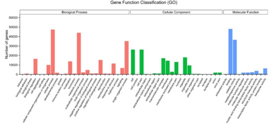 For the global functional analysis, 87,236 unigenes were annotated in the GO database and were classified into 56 functional groups, including 25 groups in the biological process, 21 in the cellular component, and 10 in the molecular function (Figure 3). Within the biological process, ‘cellular process’ (GO: 0009987; 47,389 unigenes) and ‘metabolic process’ (GO: 0008152; 43,972 unigenes) were predominant. In the cellular component category, the two main groups were the ‘cell’ (GO: 0005623; 26,159 unigenes) and ‘cell part’ (GO: 0044464; 26,129 unigenes). The terms ‘binding’ (GO: 0005488; 48,030 unigenes) and ‘catalytic activity’ (GO: 0003824; 36,550 unigenes) were the most common in the molecular function category. Comparing GO annotations of up-regulated genes under red and blue light treatments with those that were obtained under darkness, revealed that these genes were closely related to photosynthesis, which was consistent with previous reports stating that red and blue light were the main light sources for photosynthesis [].