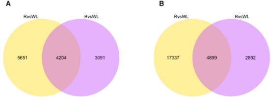 In order to identify differentially expressed genes (DEGs) in different treatment groups, the fragments per kilobase of exon per million mapped fragments (FPKM) values of the assembled unigenes were calculated. Under red light and blue light treatments, 9855 and 7295 unigenes, accounting for 3.6% and 2.7% of the total unigenes (271,932), respectively, were significantly overexpressed by at least 2-fold (Figure 4A). In addition, under red light and blue light, 22,236 and 7791 unigenes, accounting for 8.2% and 2.9% of the total unigenes, respectively, were significantly underexpressed by at least 2-fold (Figure 4B). The Venn diagram that was constructed for the number of up- and down-regulated unigenes among the red and blue light treatments displays overlapping and unique unigenes to each condition.