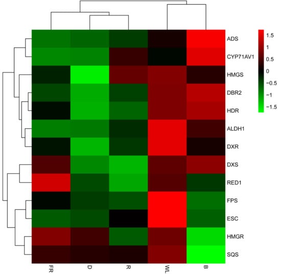 Heatmap showing variations in the expression of the genes involved in artemisinin biosynthesis. D—darkness; FR—far red light; WL—white light; R—red light; B—blue light. HMGS—3-hydroxy-3-methyl-glutaryl coenzyme A synthase; HMGR—3-hydroxy-3-methyl-glutaryl coenzyme A reductase; DXS—1-deoxy-d-xylulose-5-phosphate synthase; DXR—1-deoxy-Dxylulose-5-phosphate reductoisomerase; HDR—hydroxy-2-methyl-2-(E)-butenyl 4-diphosphate reductase; FPS—farnesyl diphosphate synthase; SQS—squalene synthase; ECS—epi-cedrol synthase; ADS—amorpha-4,11-diene synthase; CYP71AV1—amorphadiene-12-hydroxylase; DBR2—artemisinic aldehyde Δ11(13) reductase; ALDH1—aldehyde dehydrogenase 1. Color indicates the strength of the expression signal, with gene expression becoming stronger from green to red.