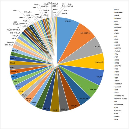 For more information about the regulation of the genes that were involved in the artemisinin biosynthesis, transcription factors were identified using the iTAK software. We identified a total of 5106 TFs. Then, the co-expression analysis was carried out to obtain the specific TFs that might have regulated the artemisinin biosynthesis gene expression (Table S2), which revealed that 365 TFs were co-expressed with TRINITY_DN75917_c2_g1 (ADS) and TRINITY_DN83022_c1_g1 (CYP71AV1) (|r| > 0.95). Within these 365 TFs, 29 were MYB TFs, 18 were bHLH TFs, 15 were bZIP TFs, and 12 were WRKY TFs (Figure 7). These TF families had been reported to play important roles in regulating artemisinin biosynthesis gene expression.
