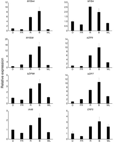 Quantitative real time PCR results obtained for selected transcription factors. D—darkness; FR—far red light; WL—white light; R—red light; B—blue light. The relative expression levels were normalized to that of the actin control. Data represent means ± standard deviation of biological triplicates.