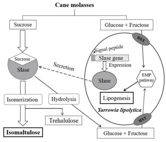 Recently, heterologous expression of SIases in non-pathogenic or food-grade strains, such as Saccharomyces cerevisiae (S. cerevisiae), Yarrowia lipolytica (Y. lipolytica), Bacillus subtili (B. subtili), and Lactococcus lactis (L. lactis), has been proved effective for isomaltulose production [,,,]. Noteworthily, the recombinant Y. lipolytica expressing SIase gene has exhibited a prominent isomaltulose yield advantage over other hosts, which meets the requirement of isomaltulose commercialization [,]. Since sucrose substrate takes a substantial part of the total production cost, reusing low-cost materials rich in sucrose can be a feasible way to reduce the cost.