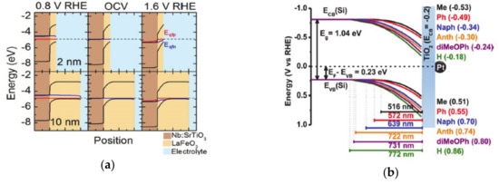 One method of achieving energy conversion efficiency is to use a multi-junction in the electrode, such as coupling of the catalysts on the light-absorbing semiconductor surface, or an adaptive junction to separate the charge carriers efficiently. Functionalization of the electrode with molecules suffers from the limited stability during catalytic operation under harsh condition, and compensation of the surface dipole of functionalizing molecules that is caused by the electrolyte double layer [85,86,87]. Thus, controlling the solid-solid junction is another way to control the charge transfer and separation processes, which determines electrochemical properties such as the generated built-in potential, open-circuit potential, and photovoltage [1,88,89]. Insertion of different materials inside the electrode induces a new charge concentration equilibrium at the solid-solid junction and induces band bending that controls the charge transfer and accumulation at the solid-liquid interface. In addition, the insertion of molecules within solid-solid interfaces generates a dipole moment that changes the photovoltage and promotes charge transfer toward the surface of the electrode [88]. Furthermore, the catalysts at the solid-liquid interface can be chemically transformed as the electrolyte ions permeate into the materials. In this way, new junctions are generated, and the electrochemical properties of the system are changed during the operation of the catalytic reaction. The modulation of the solid-solid interface changes the accumulated charge concentration at the surface, the photocurrent, the photovoltage, and the onset potential for the catalytic reaction. When the various thicknesses (2–25 nm) of LaFeO3 are deposited on the Nb-doped SrTiO3, the films show a thickness-dependent charge transfer conductivity, and thus, a change in the open circuit potential. This is because the band bending of the valence-band in LaFeO3 at the solid-solid interface generates sensitivity to the thickness of the materials (Figure 4a) [90,91,92]. Thus, in an absorber-metal oxide device structure, the thickness of the metal oxide layer, which functions as an insulator, could control the barrier height and further improve the photovoltage [91,93,94].