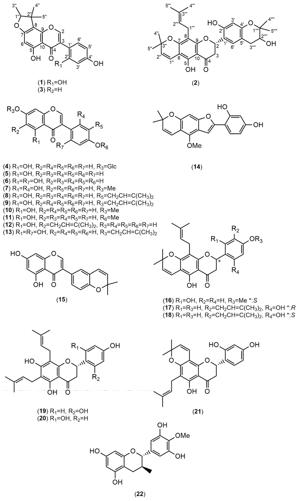 - Li, H.; Yang, M.; Miao, J.; Ma, X. Prenylated isoflavones from Flemingia philippinensis. Magn. Reson. Chem 2008, 46, 1203–1207. [Google Scholar]
