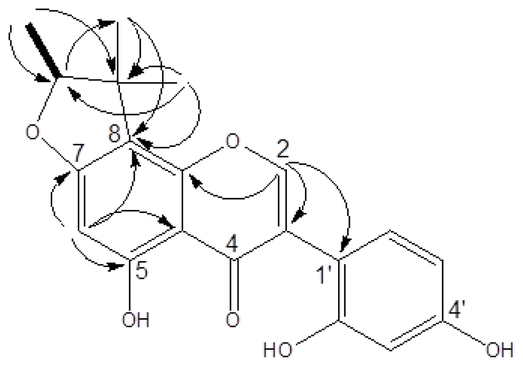 Compound 1 was obtained as a yellow amorphous solid. The HRESIMS of 1 showed a molecular ion at m/z 377.1001 [M + Na]+, indicating a molecular formula of C20H18O6 (calculated 377.1005). UV absorptions at 263, 295, and 335 nm suggested the presence of an isoflavone skeleton. The IR spectrum showed characteristic absorptions for a hydroxy (3377 cm−1), carbonyl (1651 cm−1), and aromatic (1615 and 1506 cm−1) functionalities. The 1H NMR of 1 (in acetone-d6) showed a signal at δH 8.19 (1H, s), which represented a characteristic signal of H–2 in the isoflavone nucleus (Table 1). From the COSY spectrum, the correlation of one oxymethine (δH 4.57, 1H, q, J = 6.4) with one methyl (δH 1.4, 3H, d, J = 6.4), as well as the observed HMBC correlations (Figure 2), suggested that a furan moiety is fused to ring A in 1. The 1H and 13C NMR data of 1 (acetone-d6, Table 1) were similar to those of a previously identified isoflavone, known as 5,7,4′-trihydroxy-4″,4″,5″(ξ)-trimethyl-4″,5″-dihydro-furano-(7,6,2″,3″)isoflavone []. Guided by the reported data of the known compound, we were able to elucidate the structure of compound 1. Acetone-d6 and pyridine-d5 were used as solvents for 1H and 13C NMR analysis of 1 and the spectra were compared to those of the known compound []. For example, in compound 1 we noticed an ABX spin systems at δH 6.49 (1H, d, J = 2.2), 6.43 (1H, dd, J = 8.4, 2.2), and 7.12 (1H, d, J = 8.4) indicating the presence of unusual 1′,2′,4′-trisubstitutions on ring B as well as an aromatic proton on ring A at δH 6.22 (1H, s). These data were similar to those reported for the known compound [].