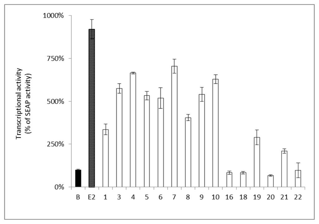 Estrogenic activity in MCF-7 cells of pure components from F. macrophylla. The SEAP activity induced by the positive control, E2 (0.1 nM). Cells were treated by the target compounds (10 μM) and the SEAP activity was compared to B (Blank), which was set to 100% SEAP activity. Each column represents a percentage of SEAP activity and is expressed as mean ± SEM (n = 4).